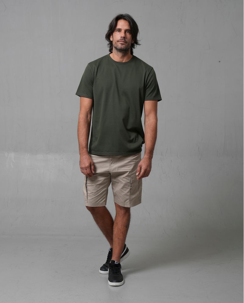 Esta bermuda cargo es perfecta para el hombre moderno que busca comodidad y estilo en su día a día. Confeccionada con un 98% de algodón y 2% de elastano, ofrece una estructura recta y ligeramente holgada que llega hasta la rodilla. Su diseño incluye bolsillos cargo a los lados, además de los clásicos delanteros y traseros, y una doble costura visible que garantiza mayor resistencia. La cremallera y las trabillas para cinturón añaden funcionalidad, mientras que el color sólido oscuro le da un acabado limpio y tradicional.