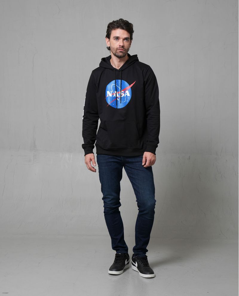 Características: Corte regular con ajuste cómodo, capucha con cordones ajustables, logo de la NASA de gran tamaño en el frente, texto de la marca en la manga, color negro sólido.