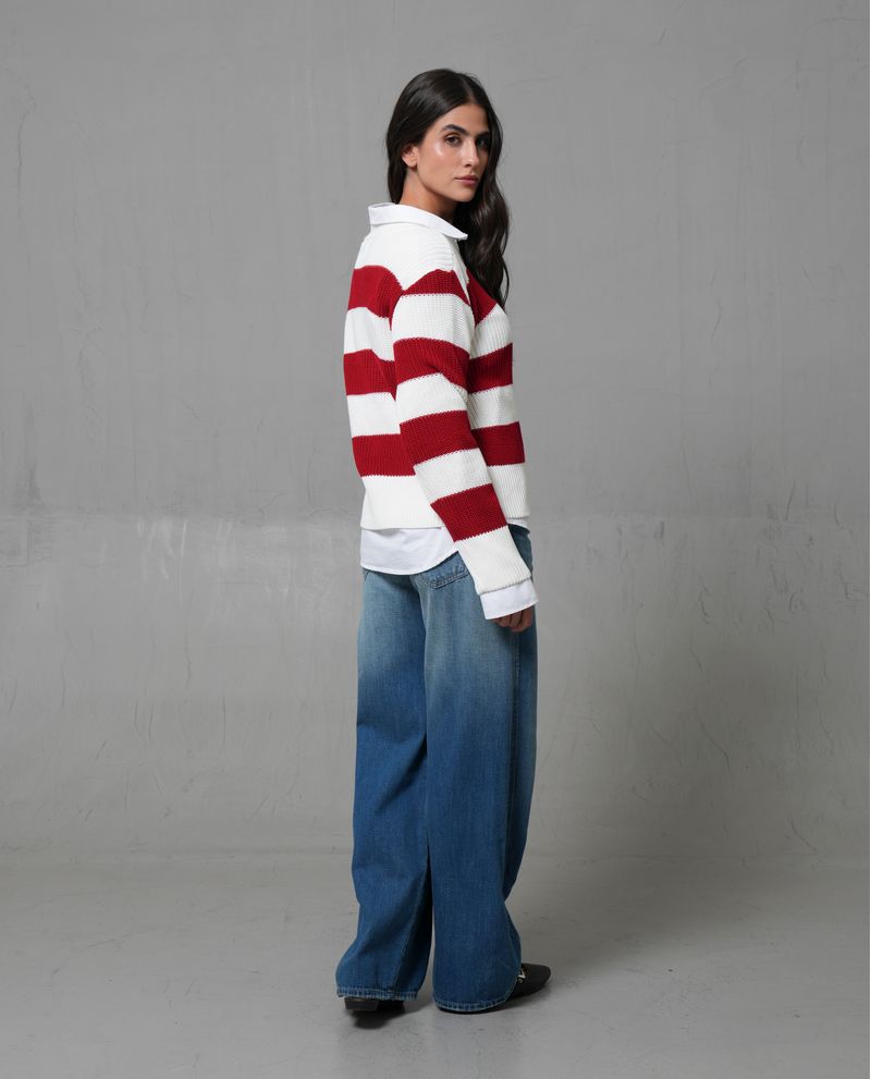 Este buzo de rayas horizontales en rojo y blanco es una prenda esencial para cualquier armario femenino. Confeccionado al 100% en acrílico, ofrece un ajuste cómodo y una caída recta que se adapta a cualquier figura. Su diseño de rayas preteñidas le da un toque moderno y versátil, ideal para el uso diario.