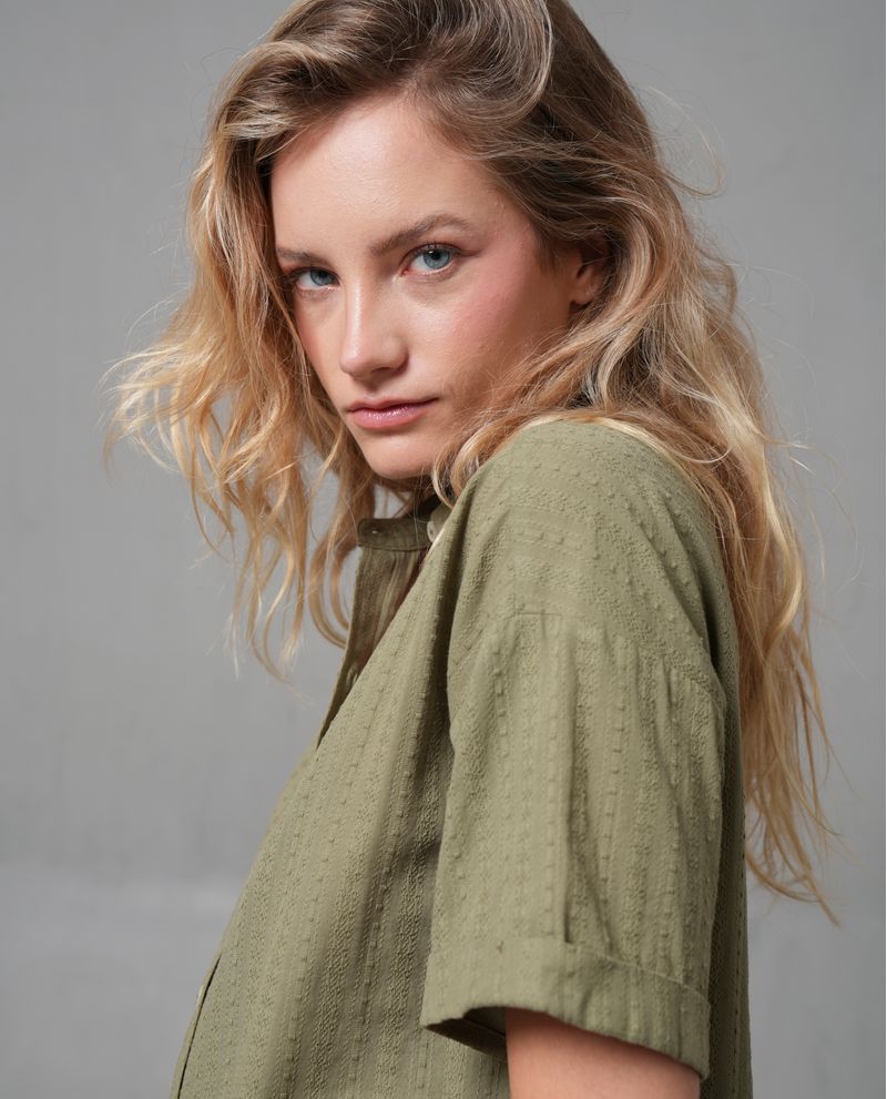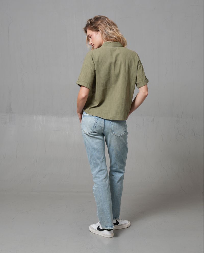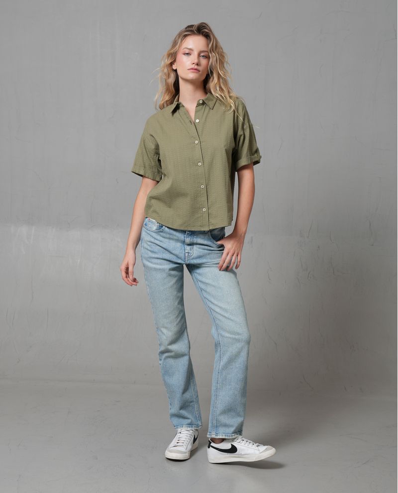 Características: Corte regular, silueta algo holgada, caída recta y fluida, botones al frente, textura o patrón sutil en verde oliva.