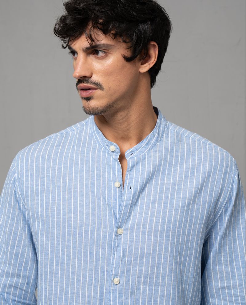 Esta camisa de manga larga con cuello neru llega a tu clóset con detalles renovados que harán la diferencia en cada look. Está confeccionada en un textil con mezcla de lino y su diseño preteñido a rayas le da un aire auténtico y versátil. Cuenta con perilla de botones y una marquilla decorativa en el inferior que añade un toque sutil pero distintivo. Disponible en dos tonos, es una apuesta segura para looks frescos y con carácter. *El modelo usa una camisa talla L. *Algunas pantallas pueden alterar el color real de la prenda.