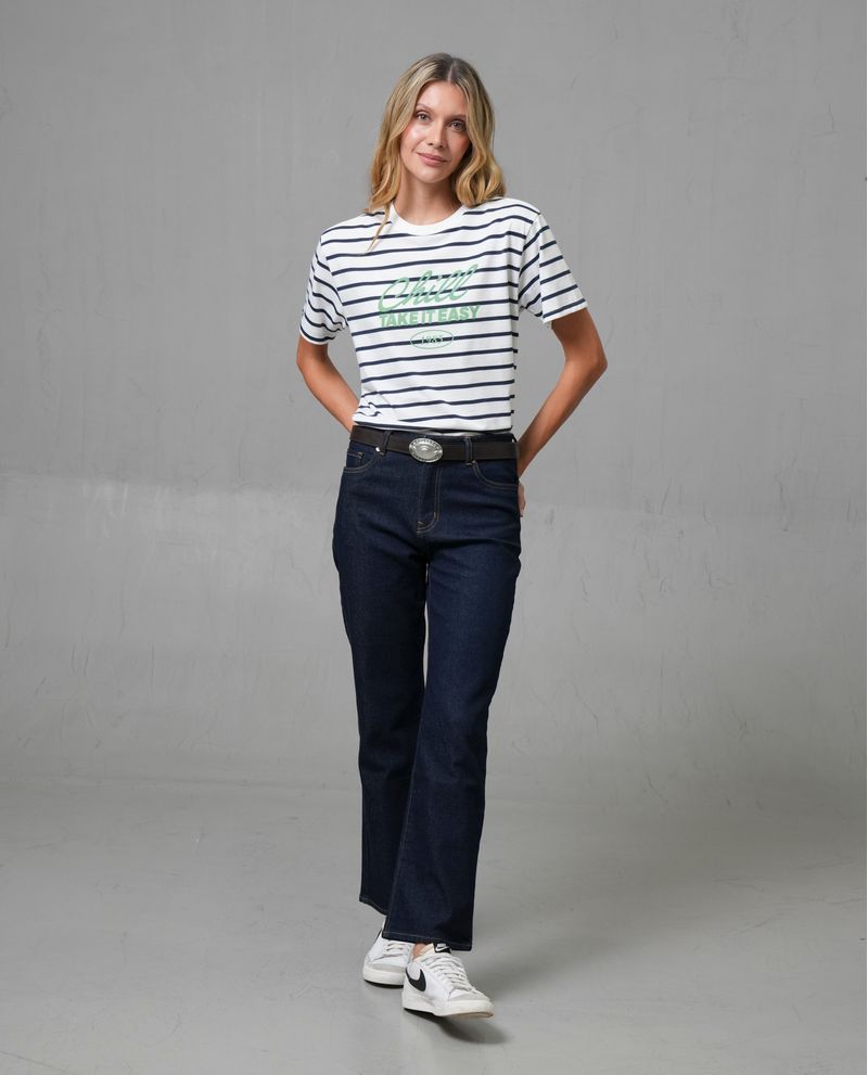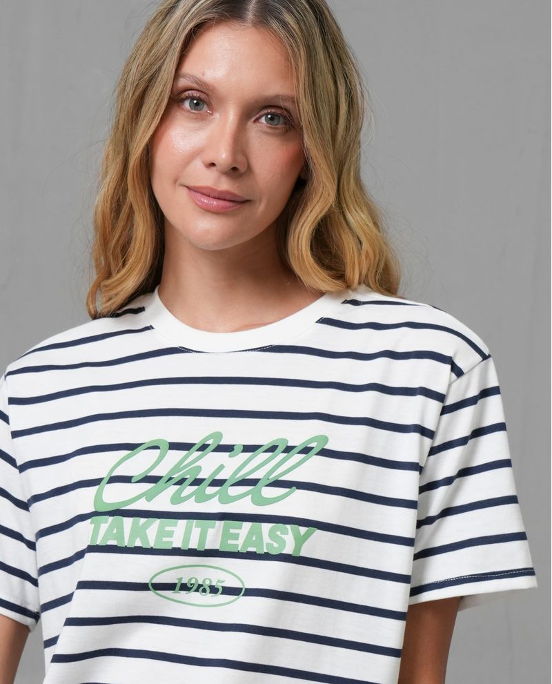 Esta camiseta de moda es una prenda esencial en el armario de cualquier mujer. Confeccionada con una mezcla de 65% poliéster y 35% algodón, ofrece una sensación liviana y cómoda. Su diseño presenta rayas horizontales en azul marino sobre un fondo sólido, complementado con un estampado grande en el pecho que dice 'CHILL' y 'TAKE IT EASY 1985' en verde. Ideal para un look casual y relajado.