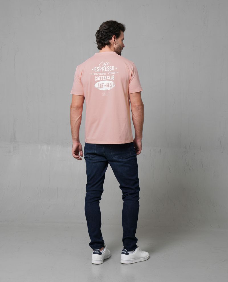 Esta camiseta de corte regular está confeccionada en 100% algodón, ofreciendo una sensación suave y cómoda al contacto con la piel. Su diseño incluye un llamativo estampado gráfico en la espalda con el texto 'Café Espresso (Youthful Vibes) Coffee Club BF-85', que le da un toque moderno y juvenil. Es ideal para ocasiones casuales, ya sea para un día relajado en casa o una salida con amigos.