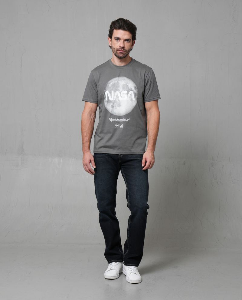 Esta camiseta de algodón 100% es perfecta para quienes buscan un estilo urbano y moderno. Confeccionada con costuras estándar, presenta un estampado grande de 'NASA' con diseño de luna en un color sólido gris. Su corte clásico y ligeramente ajustado ofrece una sensación natural sin ser ceñida al cuerpo, ideal para cualquier ocasión casual.