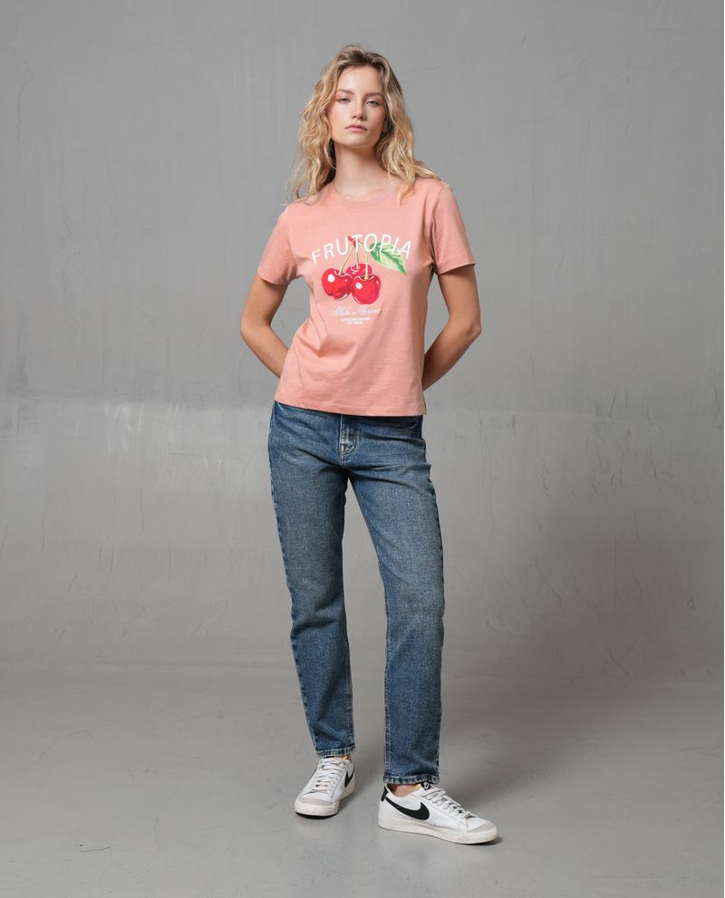 Esta camiseta de mujer presenta una silueta clásica con una caída natural que ofrece comodidad y libertad de movimiento. Confeccionada en 100% algodón, es liviana y suave al tacto, ideal para un look casual. El diseño frontal destaca por un estampado grande de cerezas con el texto 'FRUTOPIA', aportando un toque divertido y moderno. No tiene bolsillos, botones ni cierres, y las costuras visibles en el borde de las mangas y el bajo le dan un acabado limpio.