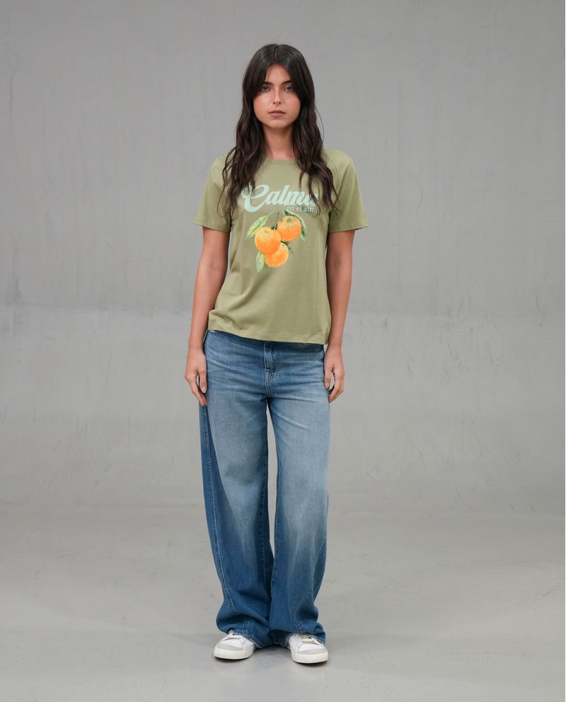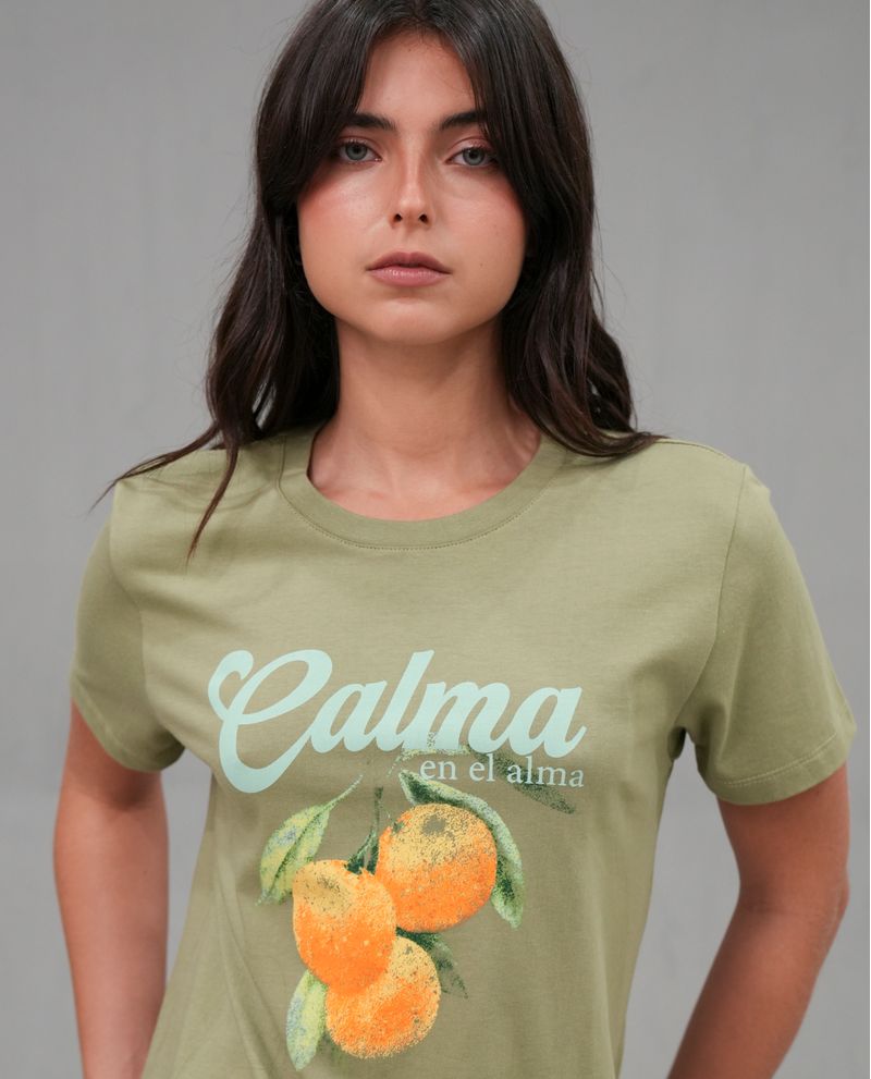 Características: Estampado grande con ilustración de naranjas y frase 'Calma en el alma'. Ajuste regular, cuello redondo, costuras estándar para mayor durabilidad.
