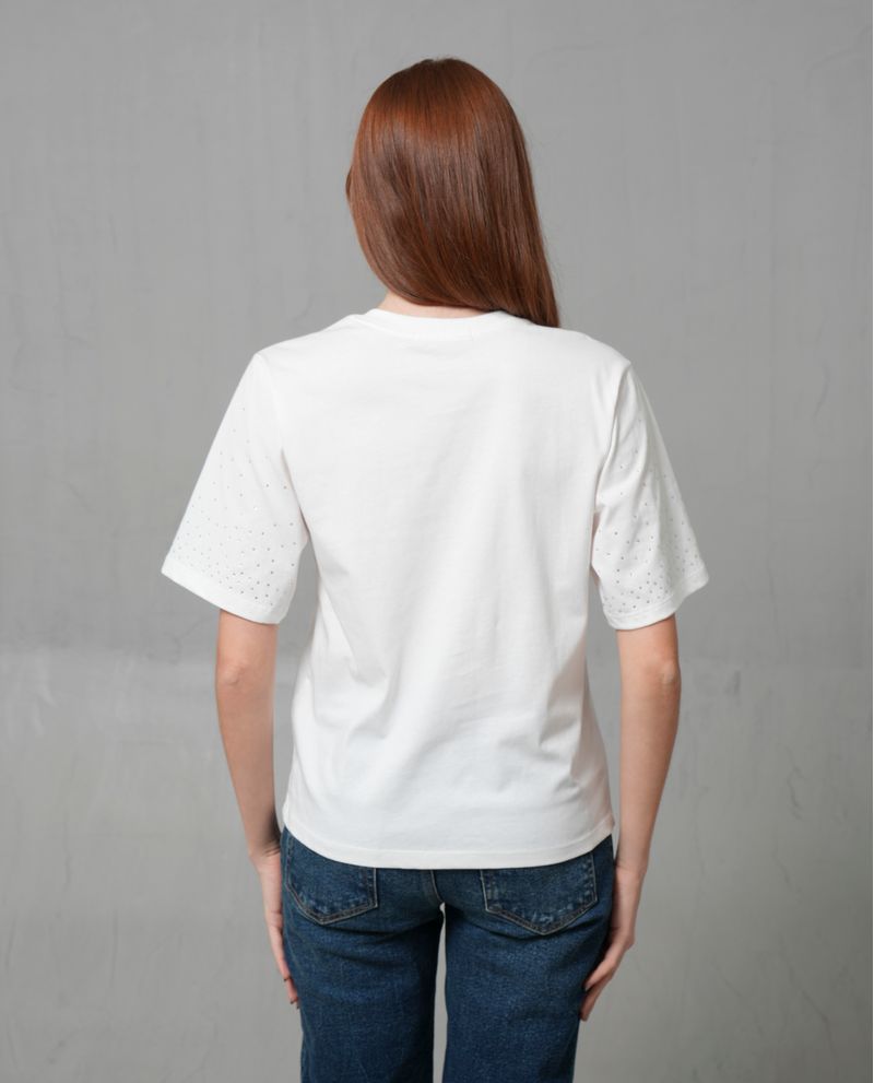 Características: Corte ajustado, cuello redondo, color blanco sólido, detalles de puntos brillantes en las mangas.