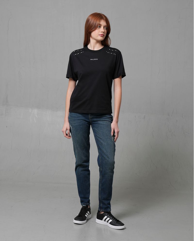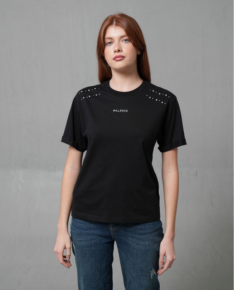 Esta camiseta de moda está confeccionada en 100% algodón, ofreciendo una sensación de suavidad y comodidad. Con un ajuste cómodo y relajado, es ideal para el fin de semana. Presenta aplicaciones de pequeños adornos brillantes en los hombros y la palabra 'BALANCE' bordada en el frente, añadiendo un toque elegante y distintivo.