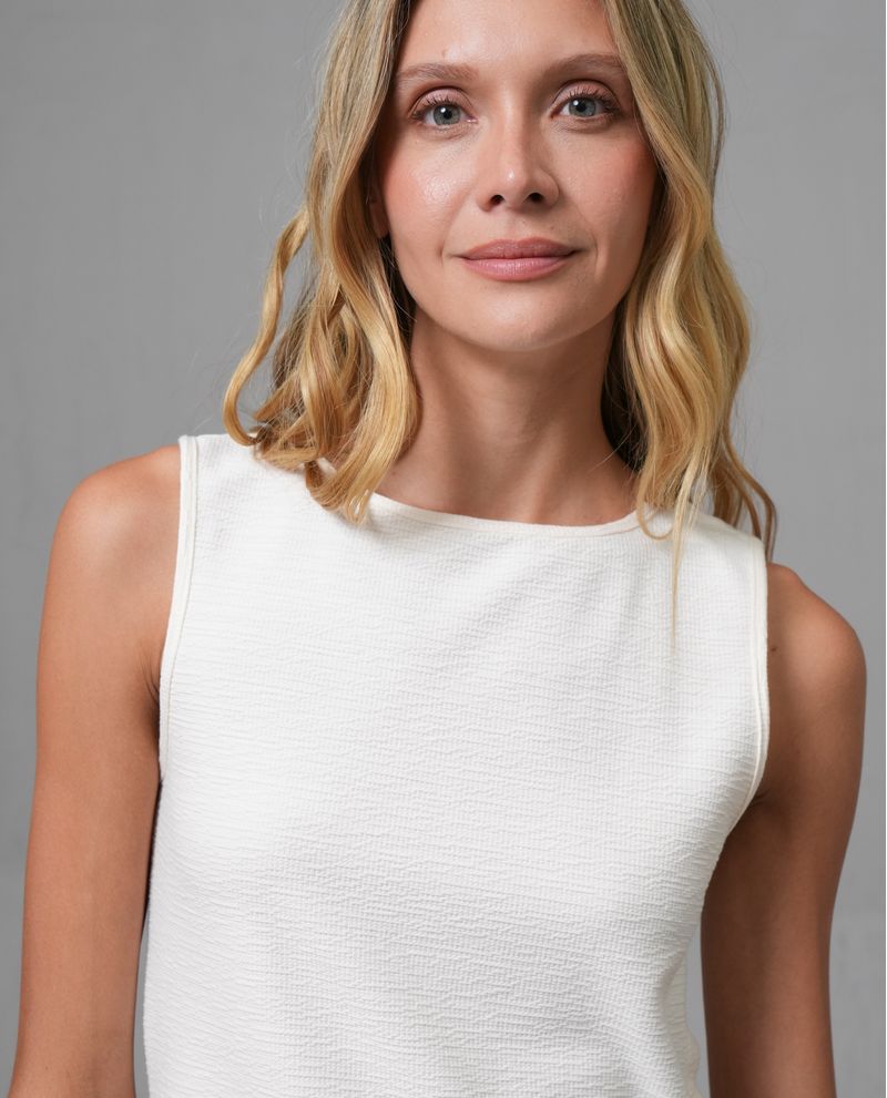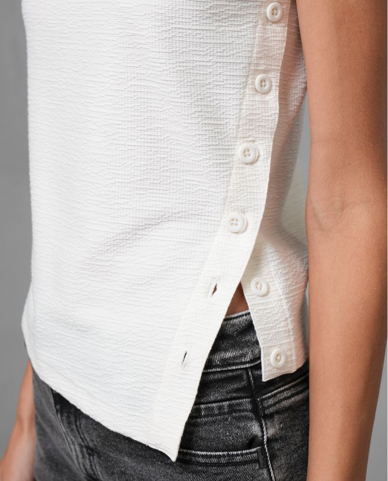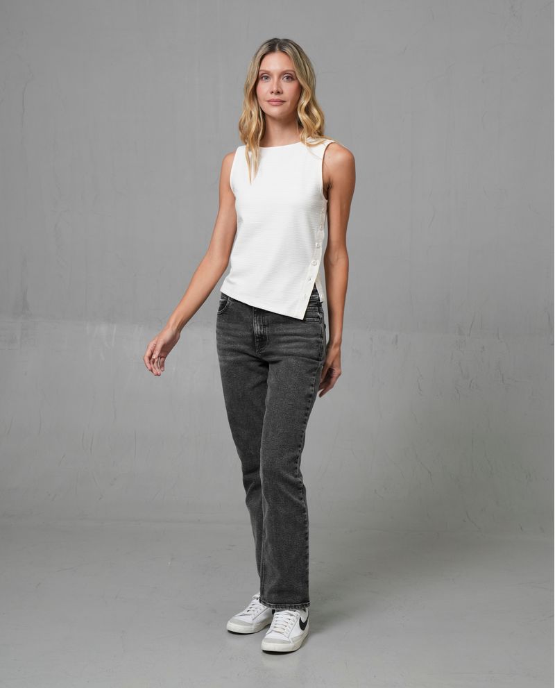 Características: Corte slim fit, silueta ajustada al cuerpo con caída recta. Detalle de botones laterales decorativos. Cuello redondo y manga corta.