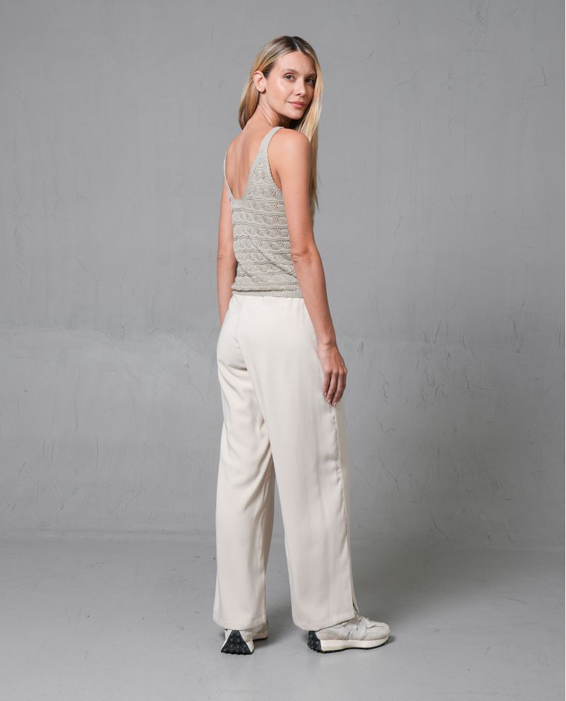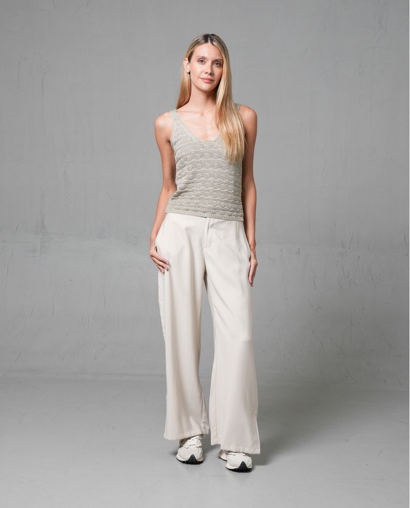 Esta camiseta tejida de manga sisa realza la figura de manera natural. Sus detalles desagujados aportan un aire fresco y en tendencia, perfecto para looks con estilo. Ideal para combinar con pantalones claros y tenis en días frescos. *La modelo usa una camiseta talla S. *Algunas pantallas pueden alterar el color real de la prenda.