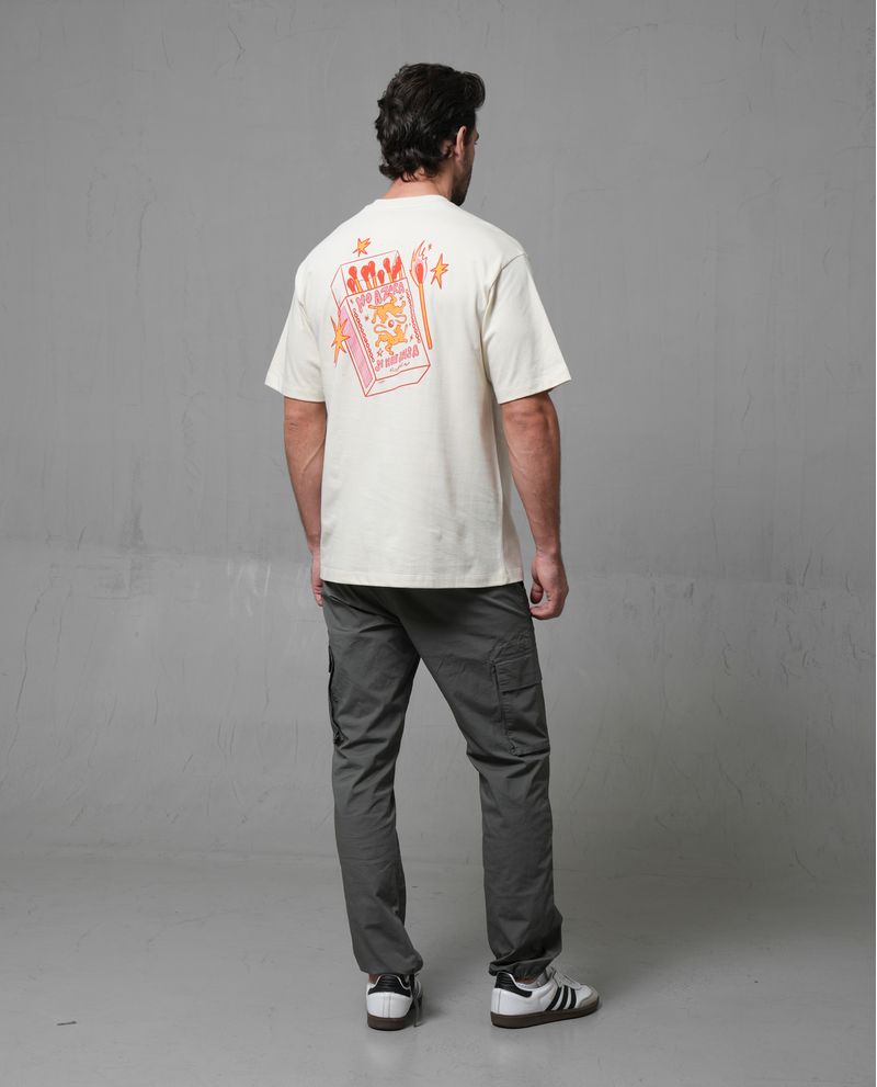 Esta camiseta de diseño gráfico vibrante es perfecta para quienes buscan estilo y comodidad. Confeccionada en 100% algodón, ofrece una sensación suave y natural al contacto con la piel. Su diseño clásico y versátil, con un ajuste regular, se adapta a una amplia variedad de tipos de cuerpo. Los detalles gráficos incluyen una caja de cerillas con elementos en colores anaranjados y rosas, que aportan un toque moderno y llamativo.
