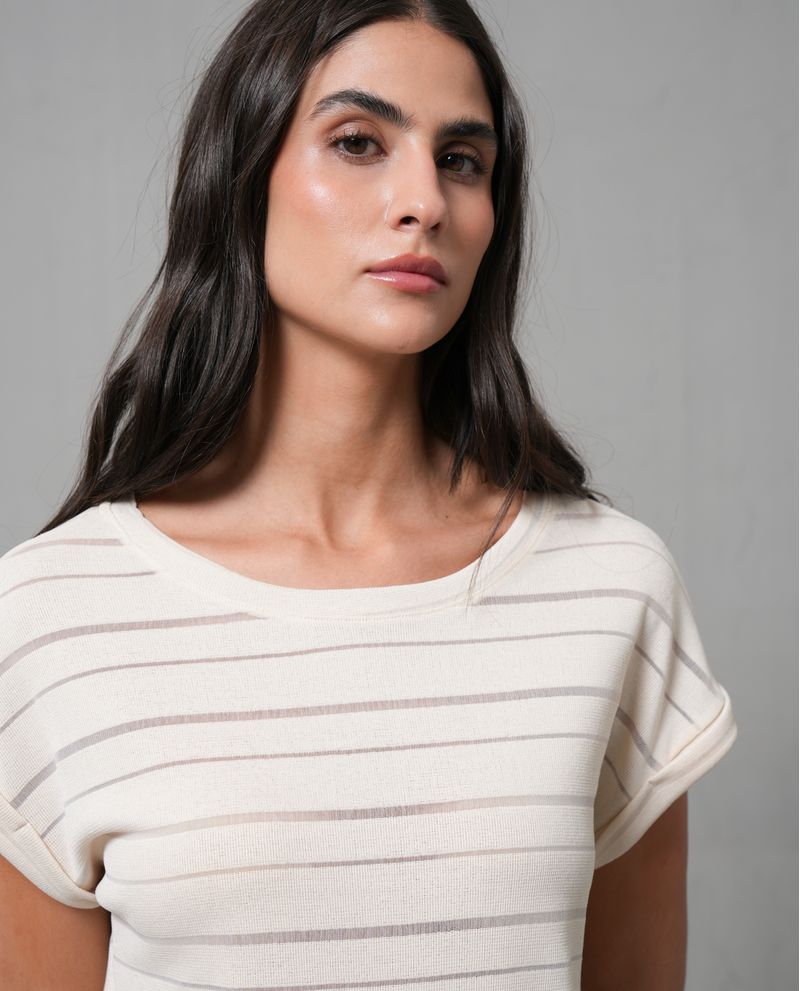 Esta camiseta de corte regular está confeccionada con un tejido de punto suave, compuesto por 97% poliéster y 3% elastano, lo que le proporciona una caída suave y una silueta relajada. Su diseño sin bolsillos ni cierres y con costuras discretas, la hace ideal para un look limpio y minimalista. El cuello redondo y el color uniforme aportan un estilo clásico y versátil.