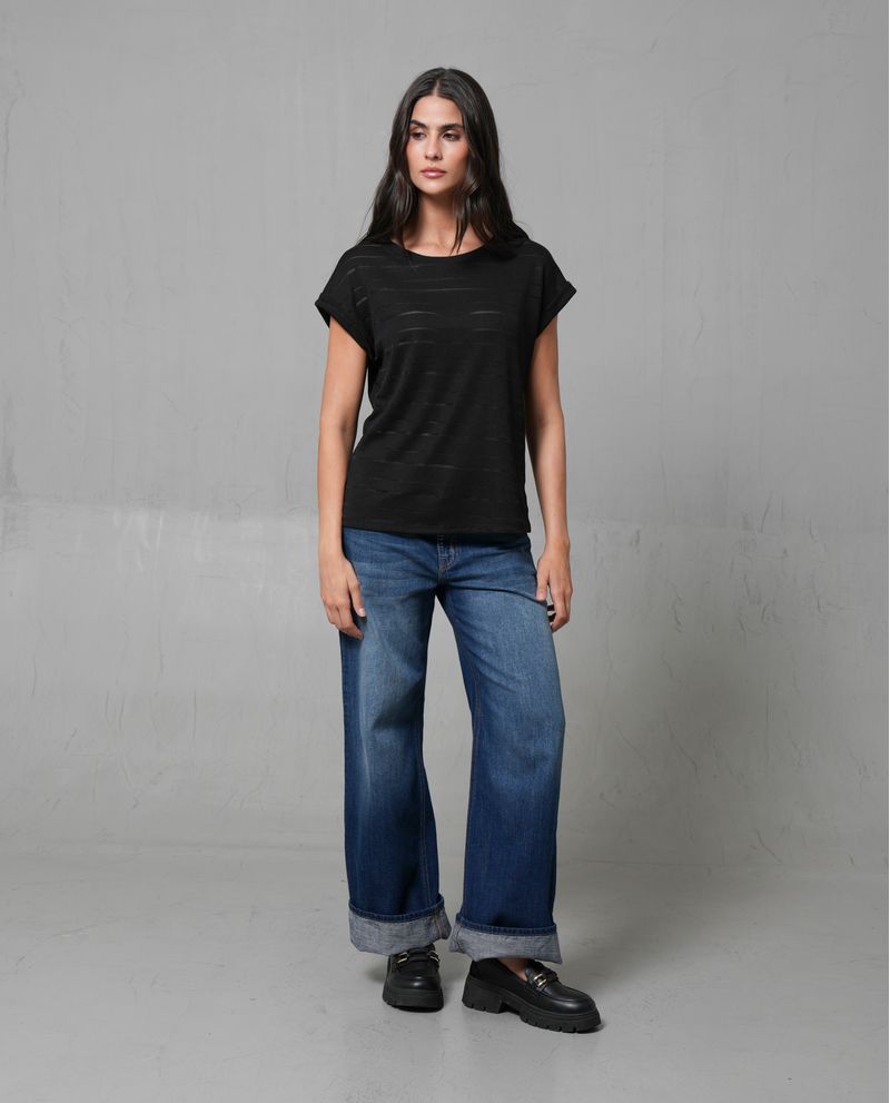 Esta camiseta de corte regular está confeccionada con un tejido de punto suave, compuesto por 97% poliéster y 3% elastano, lo que le proporciona una caída suave y una silueta relajada. Su diseño sin bolsillos ni cierres y con costuras discretas, la hace ideal para un look limpio y minimalista. El cuello redondo y el color uniforme aportan un estilo clásico y versátil.