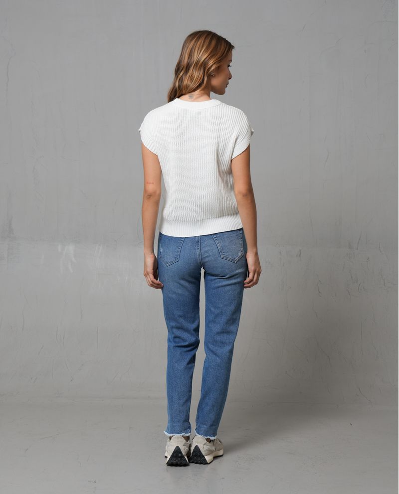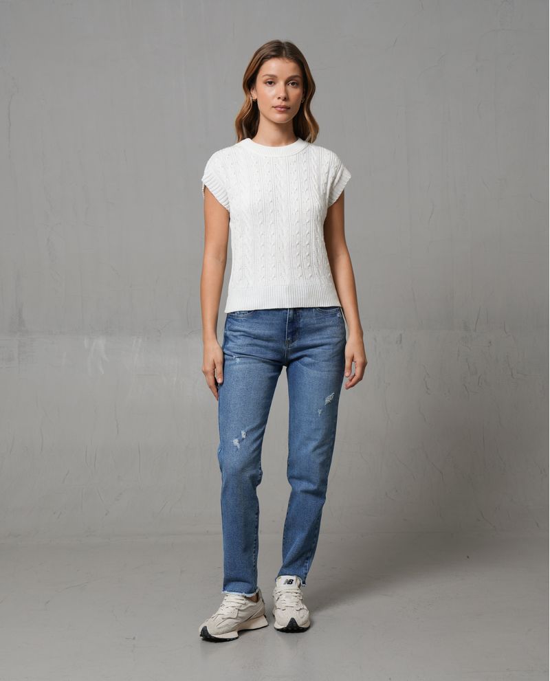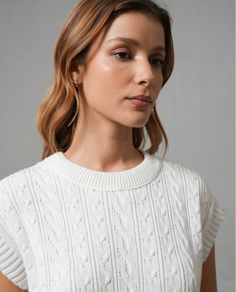 Chaleco para mujer. Fit semioversize, de manga sisa rodada y cuello redondo. Diseño cerrado en tejido trenzado con detalles de foil dorado en delantero. Combínalo con jean y tenis. *La modelo usa un chaleco talla S. *Algunas pantallas pueden alterar el color real de la prenda.