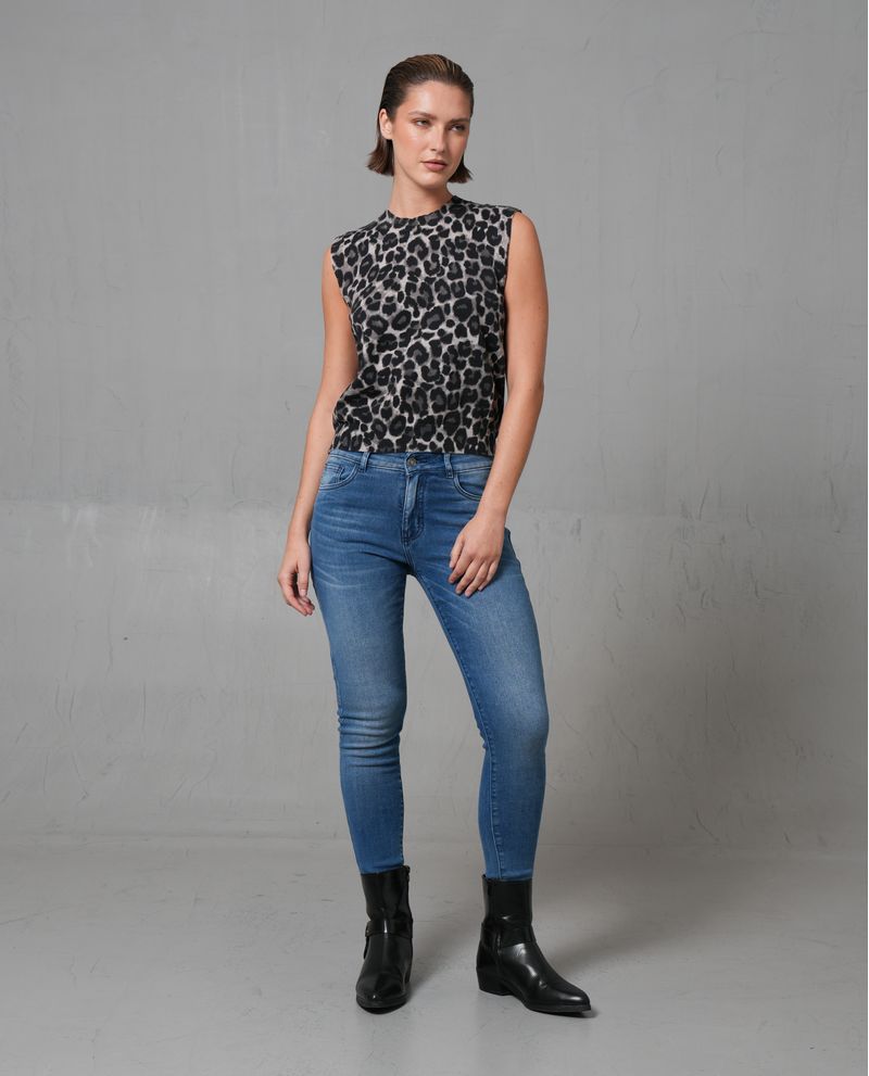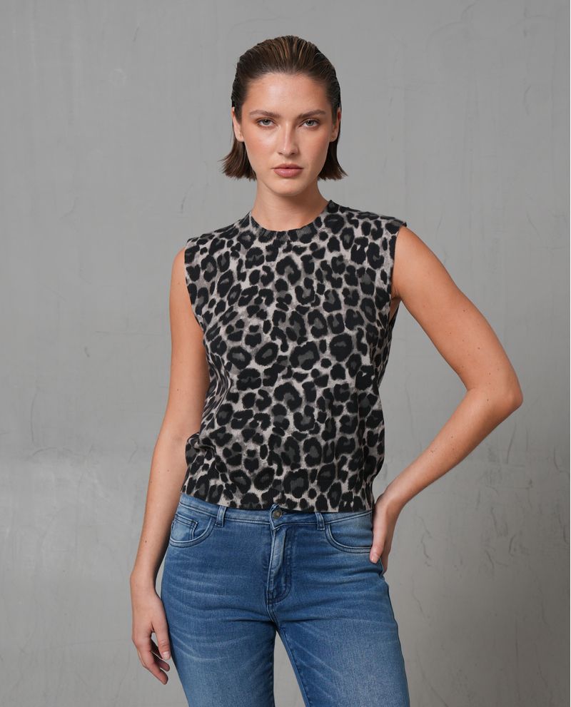 Este chaleco es una prenda de moda confeccionada en 100% algodón, con un diseño de animal print en tonos grises y negros. Presenta un cuello redondo y un ajuste regular que se adapta cómodamente al cuerpo. Su tejido liviano lo hace ideal para el uso diario.