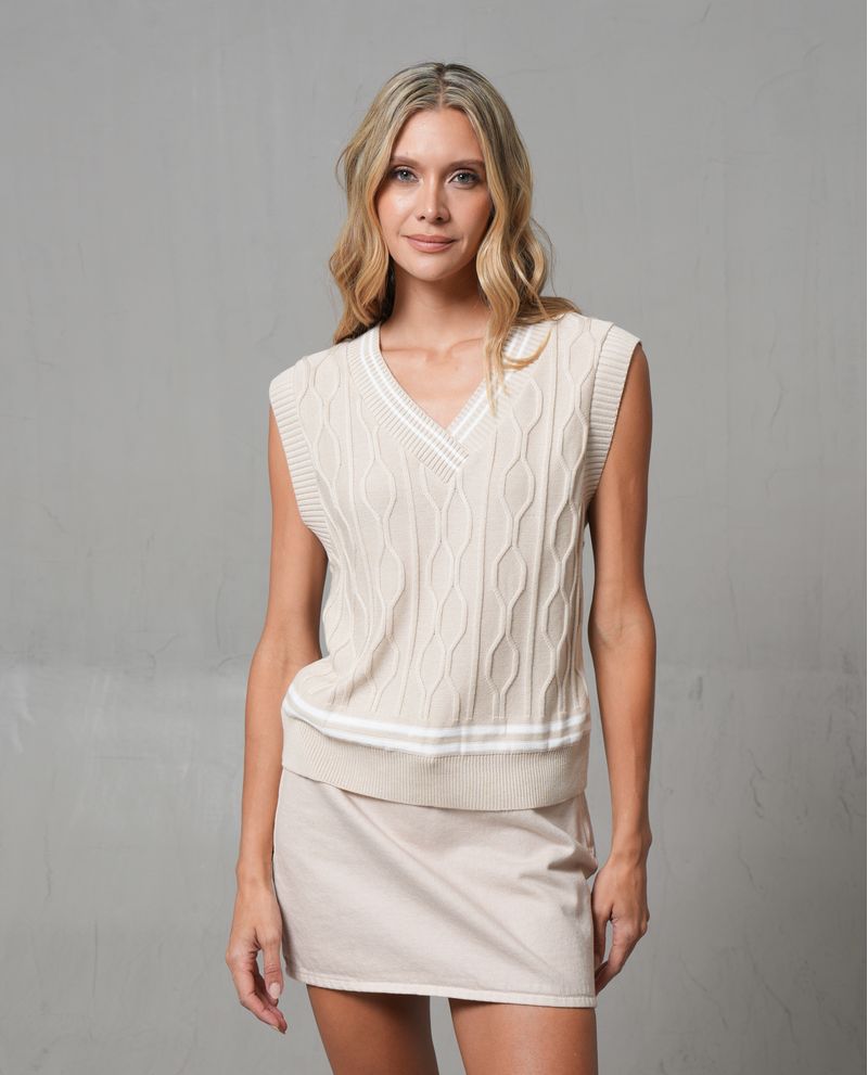 Este chaleco tejido para mujer combina textura y estilo en un diseño cerrado con escote en V. Sus detalles a tono aportan un acabado sutil que lo hace versátil para diferentes ocasiones. Ideal para usar sobre camisas o camisetas, creando capas que suman modernidad a cualquier outfit casual. *La modelo usa un tejido talla S. *Algunas pantallas pueden alterar el color real de la prenda.