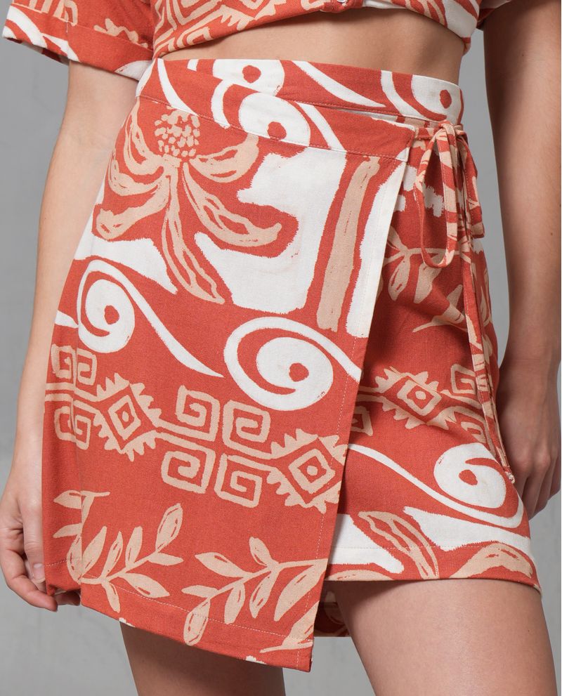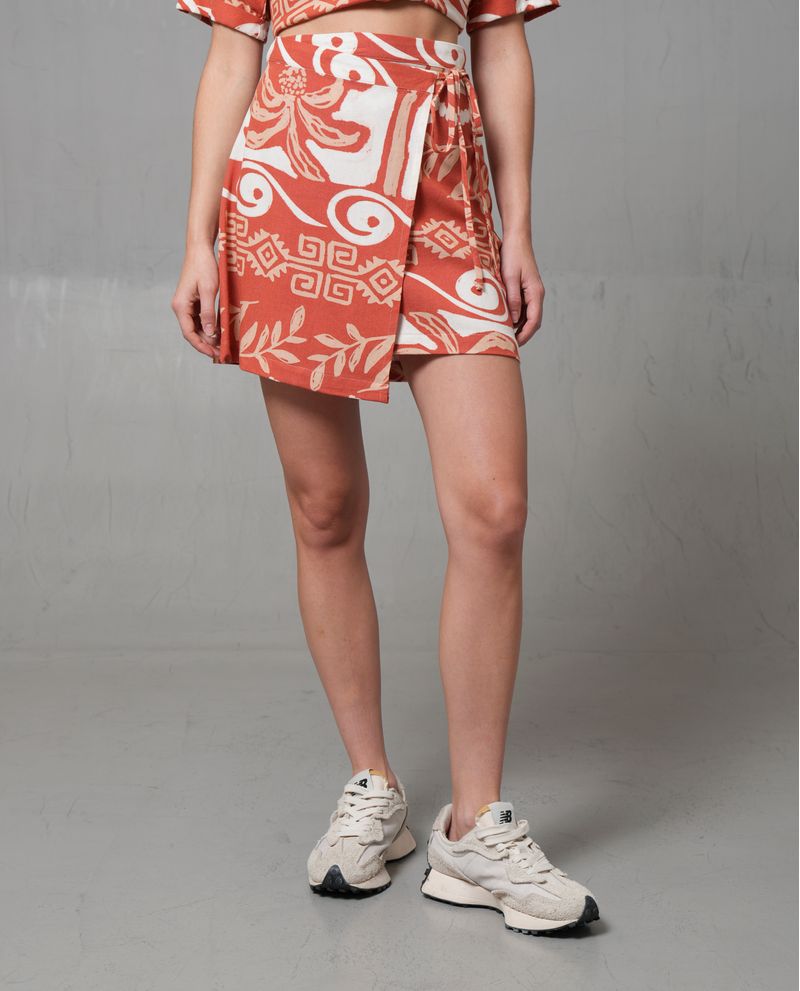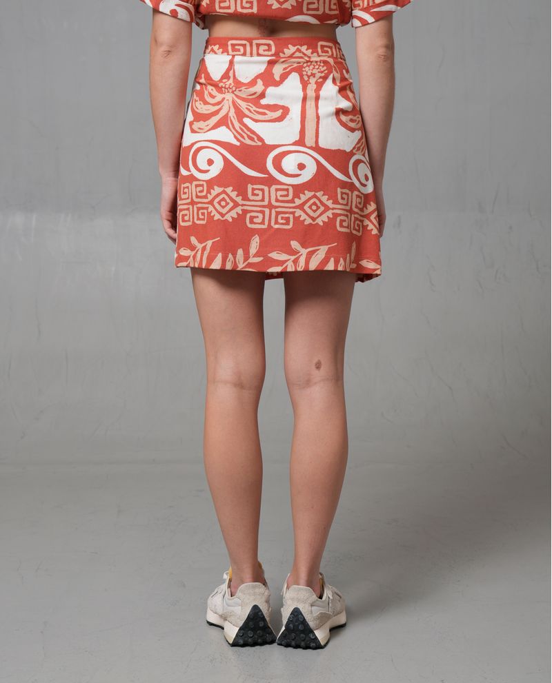Características: Estampado en tonos anaranjados y blancos con elementos geométricos y florales. Corte recto y corto, ligeramente ajustada con caída recta. Pretina integrada al diseño, sin sistema de cierre visible.
