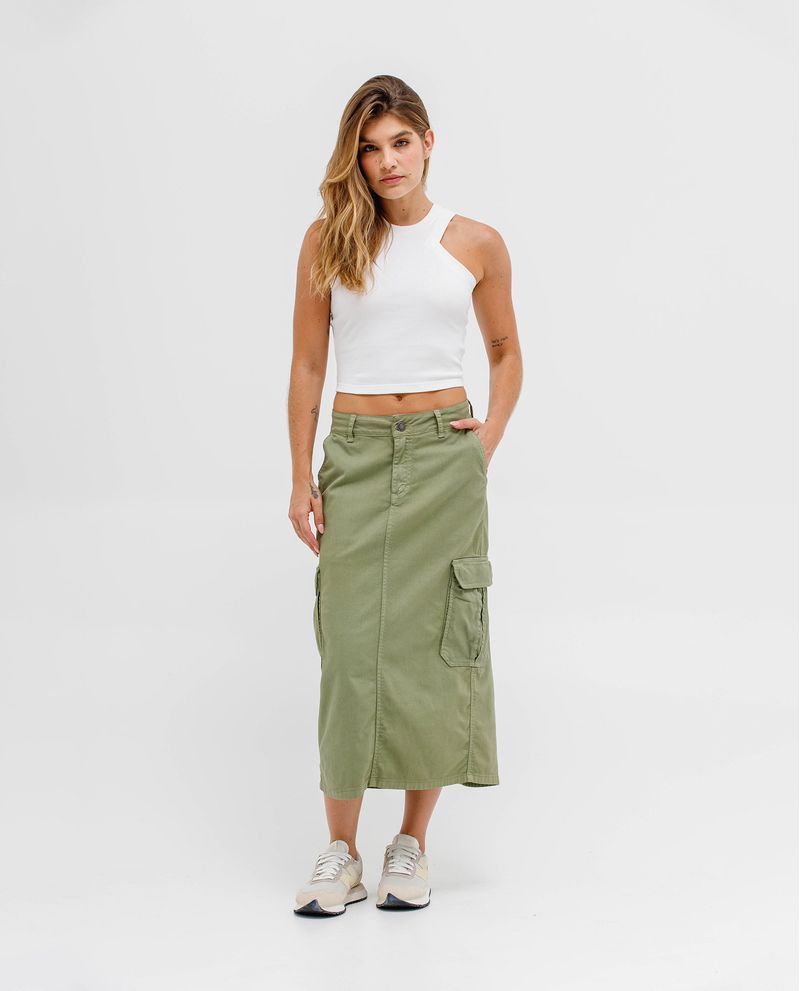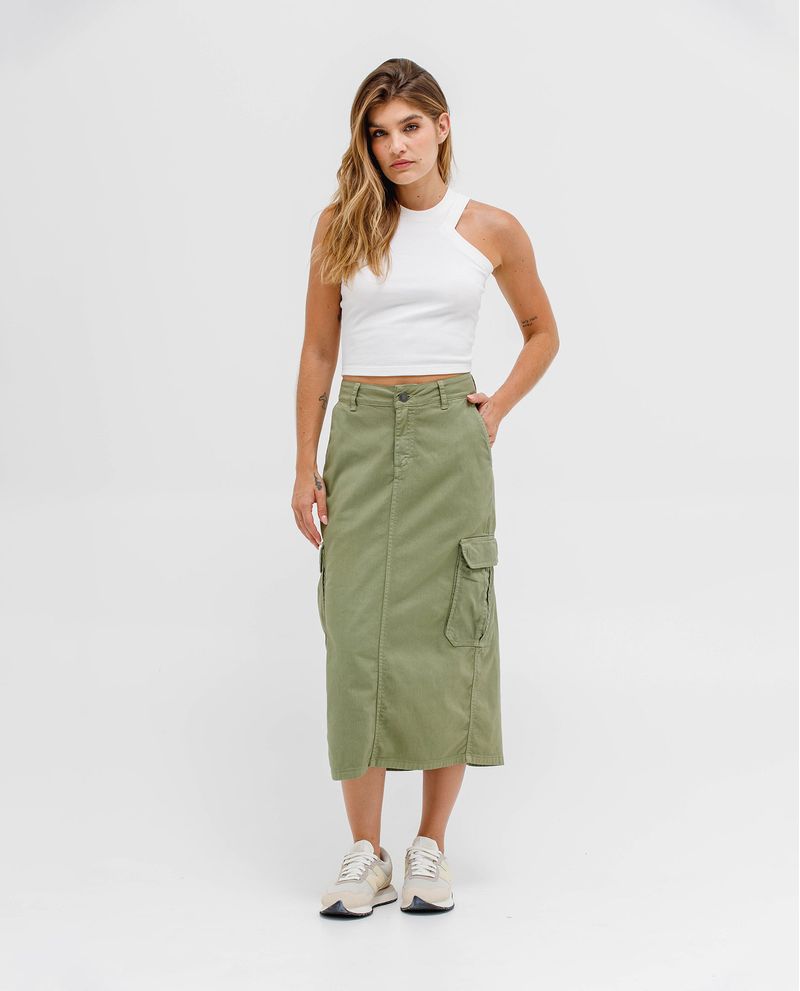 Falda para mujer. De largo midi con ajuste de cierre y botón y pasadores en pretina. Cuenta con bolsillos diagonales y tipo cargo laterales. Diseño con abertura en ruedo posterior. Úsala con camisetas ajustadas tipo crop. *La modelo usa una falda talla 6. *Algunas pantallas pueden alterar el color real de la prenda.