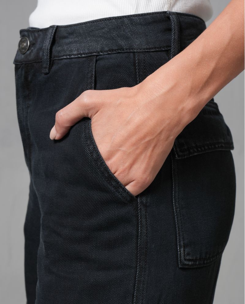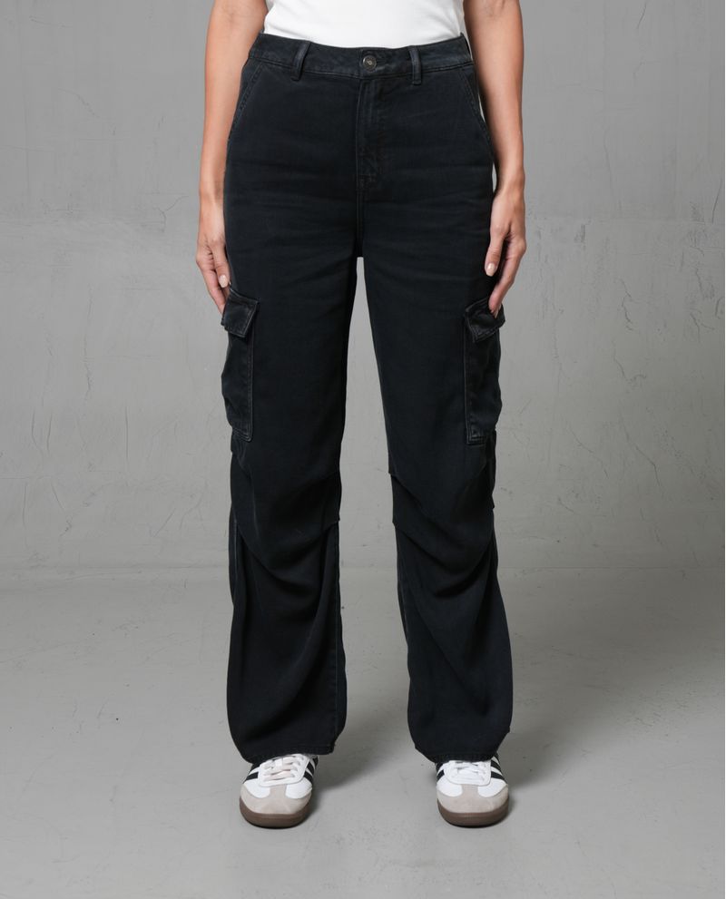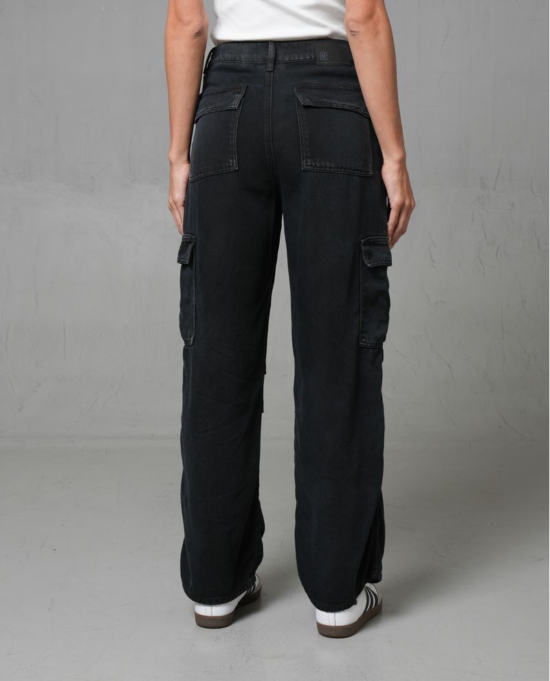 Este jean Cargo fit combina una silueta semiajustada en la cadera con una pernera suelta en rodilla y bota, logrando un equilibrio perfecto entre comodidad y estilo. Confeccionado en denim liviano color negro con fijado de color, destaca por sus bolsillos tipo cargo con tapa y el sutil realce de costuras que aporta un estilo cool. Ideal para un look en tendencia, acompañado de una camiseta blanca y tenis. *La modelo usa un jean talla 6. *Algunas pantallas pueden alterar el color real de la prenda.
