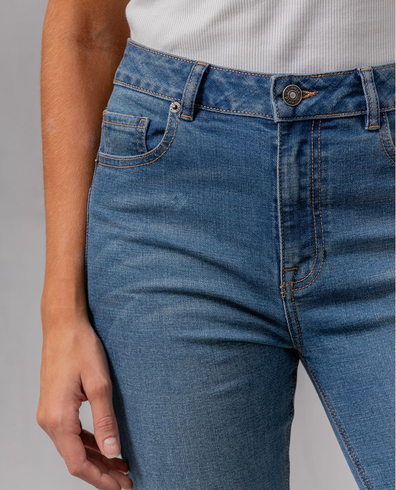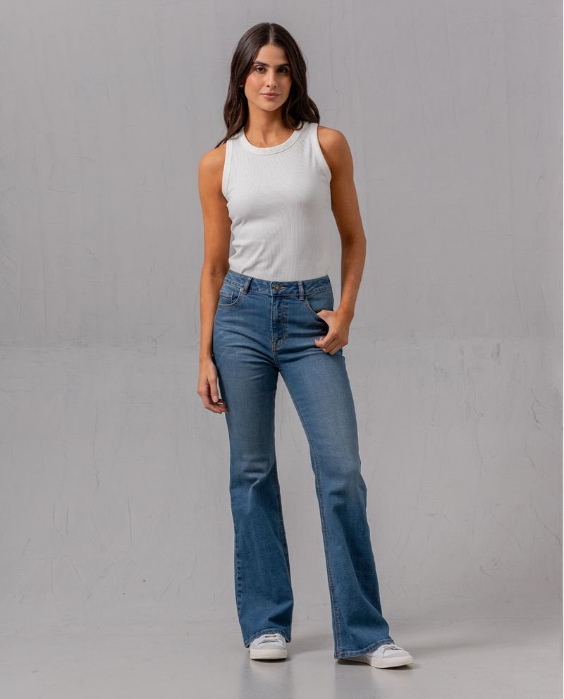 Características: Jean Magic Up + Flare con ajuste desde la cintura hasta las rodillas, ensanchándose hacia los tobillos. Costuras dobles visibles en contraste, bolsillos clásicos y trabillas para cinturón.