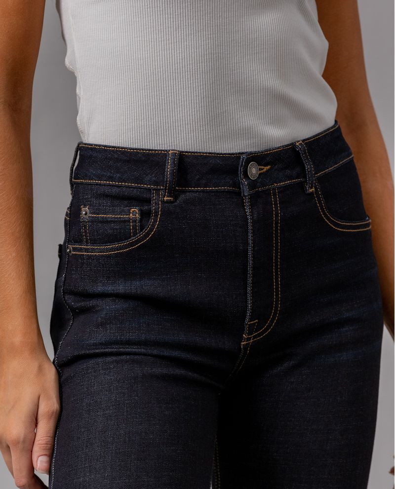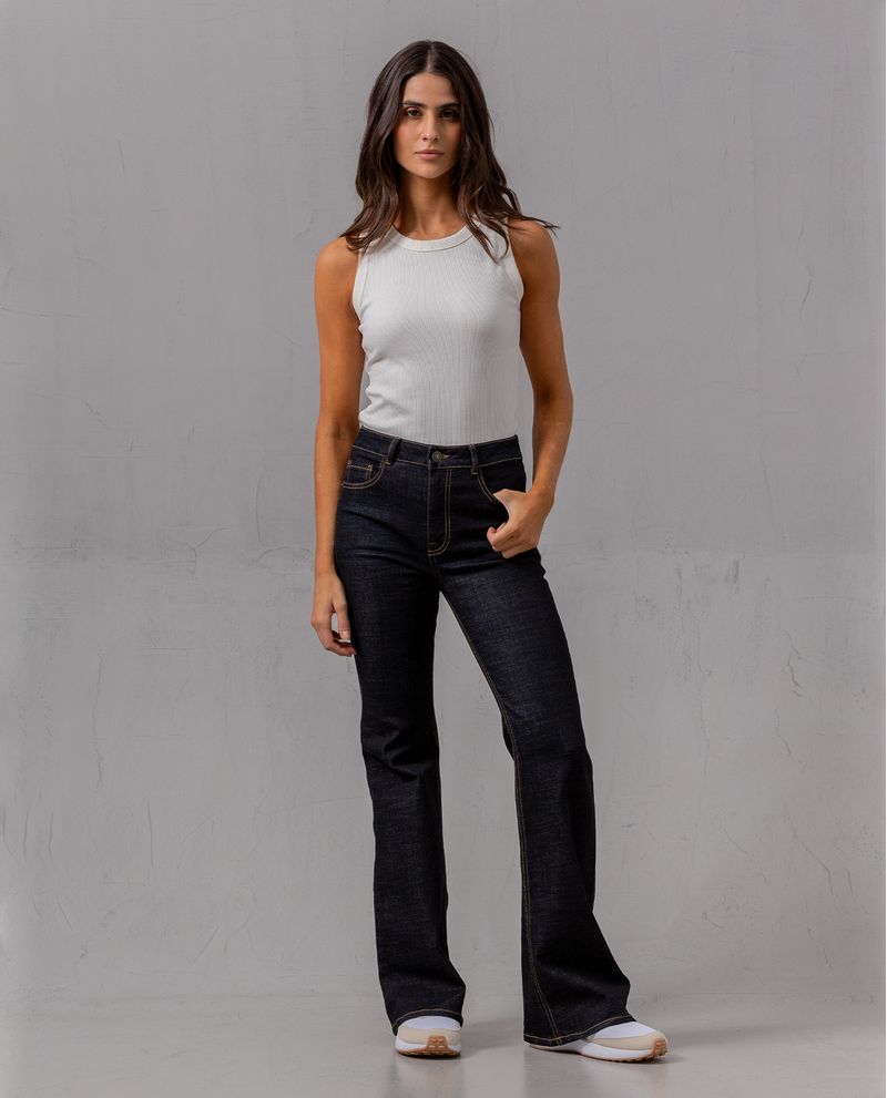 Características: Jean Magic Up + Flare con ajuste desde la cintura hasta las rodillas, ensanchándose hacia los tobillos. Costuras dobles visibles en contraste, bolsillos clásicos y trabillas para cinturón.