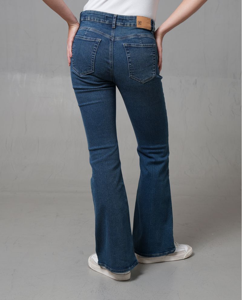 Características: Diseño regular con abertura acampanada, ajuste en cadera y muslos, denim clásico de peso medio, bolsillo extra, costuras visibles, presillas para cinturón.