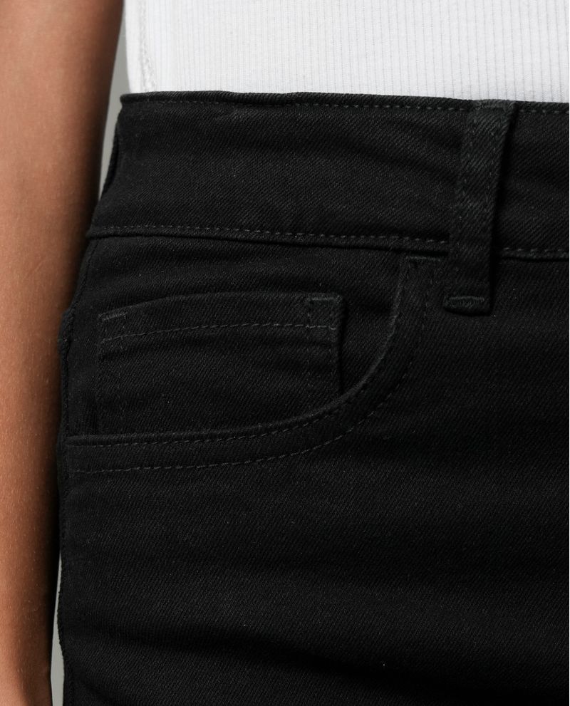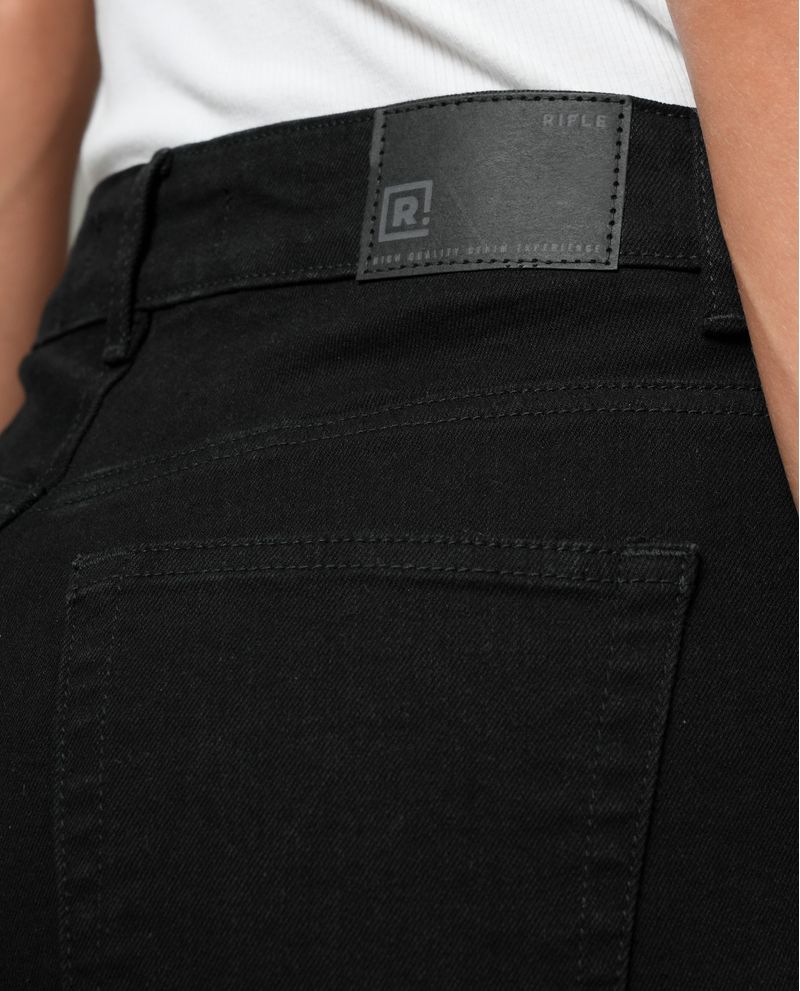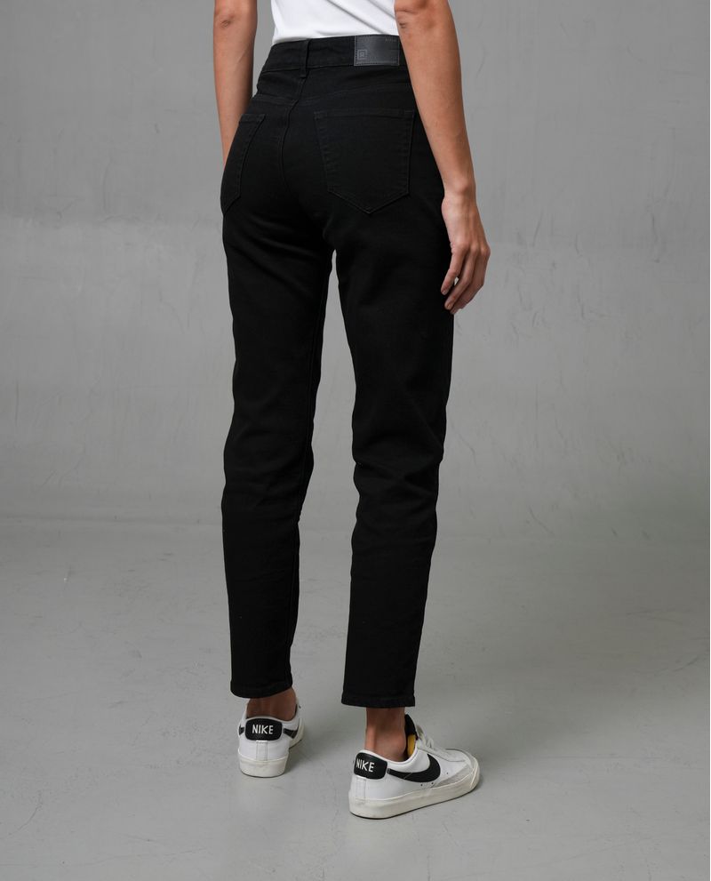 Características: Diseño slim ajustado, recto hasta el tobillo. Incluye cinco bolsillos clásicos y pasadores para cinturón. Denim en tono negro sólido, sin variaciones de color.