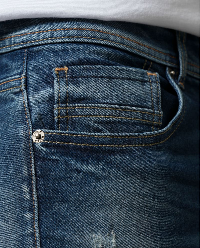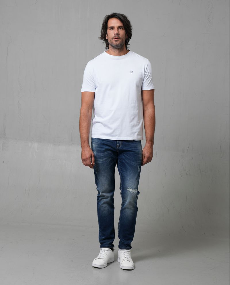 Este jean slim de tiro medio es ideal para el hombre moderno que busca comodidad y estilo. Confeccionado en una mezcla de algodón, poliéster, rayón y elastano, ofrece una ligera elasticidad que se adapta perfectamente al cuerpo sin ser demasiado ajustado. Su diseño clásico incluye costuras visibles alrededor de los bolsillos y cintura, y un cierre con botón frontal. El denim regular presenta un efecto stone wash con un desgaste sutil y un roto en una pierna, aportando un toque de moda urbana.
