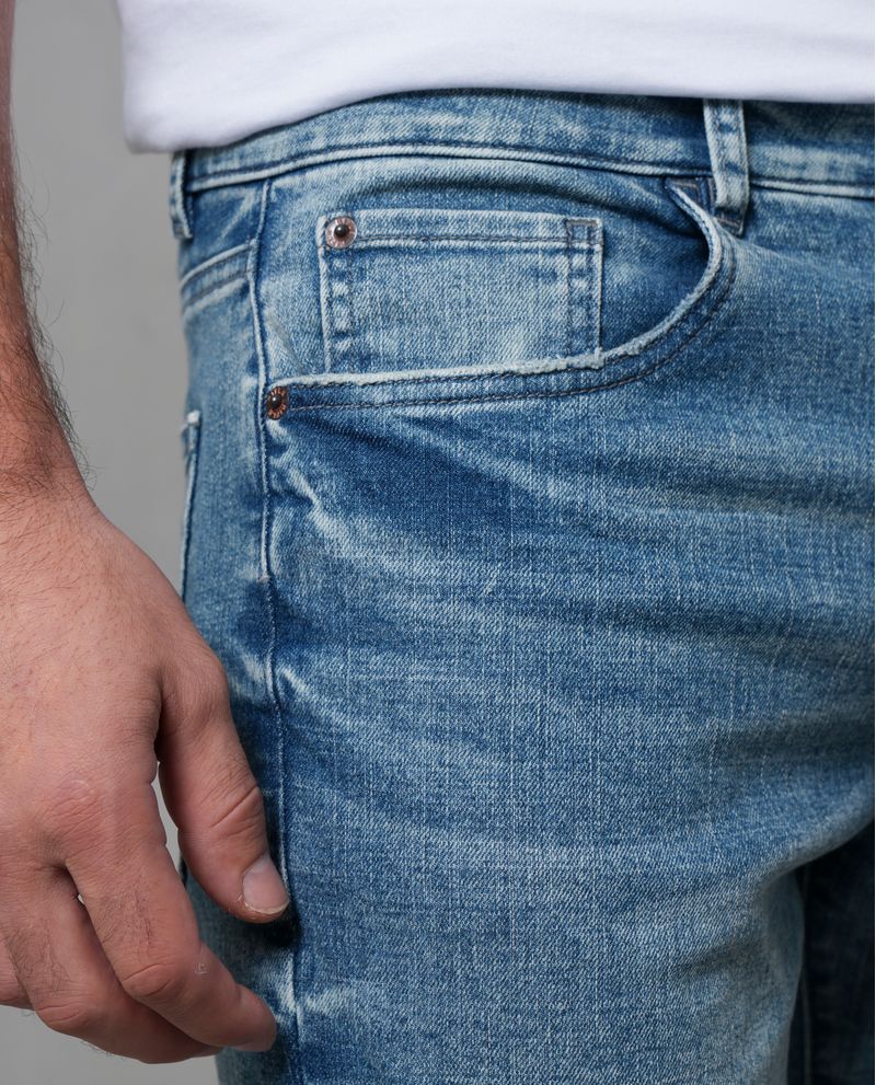 Características: Corte Super slim ajustado, tiro medio, detalles desgastados y rotos en la parte frontal, costuras estándar para mayor durabilidad, cierre de botón y cremallera, y presillas para cinturón.