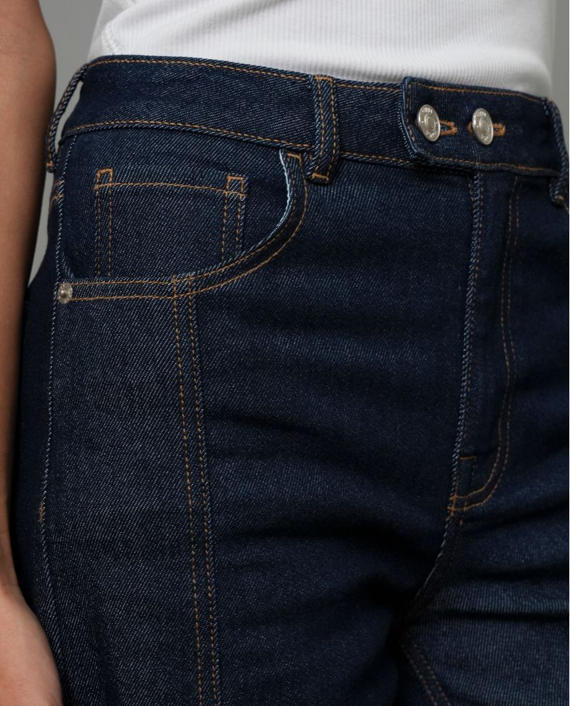 Características: El jean presenta un corte wide leg con tiro bajo, silueta recta y amplitud en las piernas. Incluye cremalleras y vistas contrastantes, además de presillas para cinturón. Su diseño clásico y sin rotos lo hace un básico imprescindible en cualquier armario.