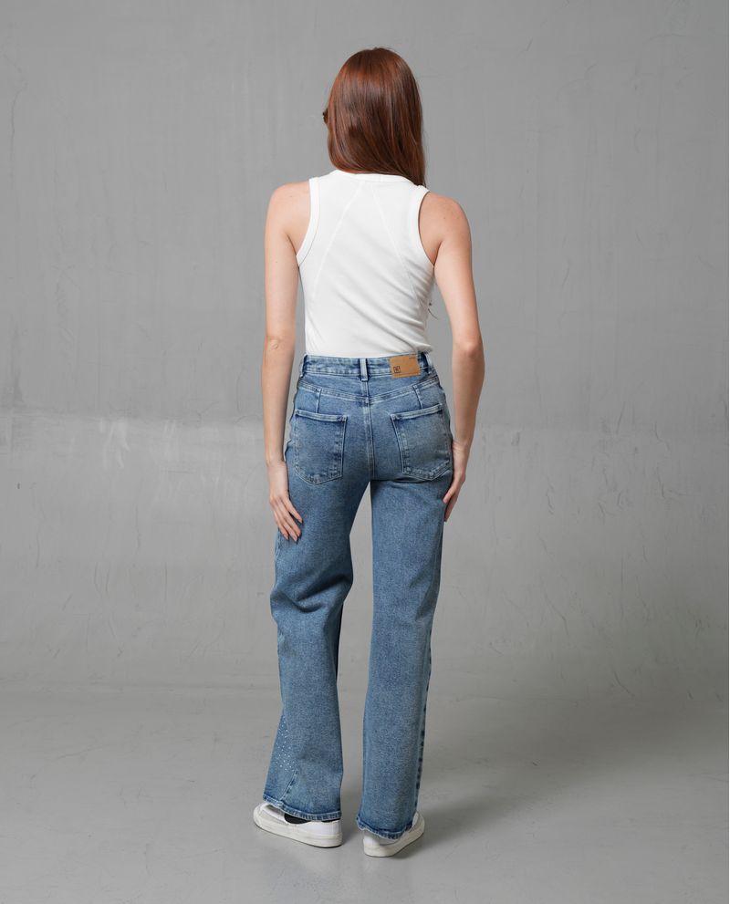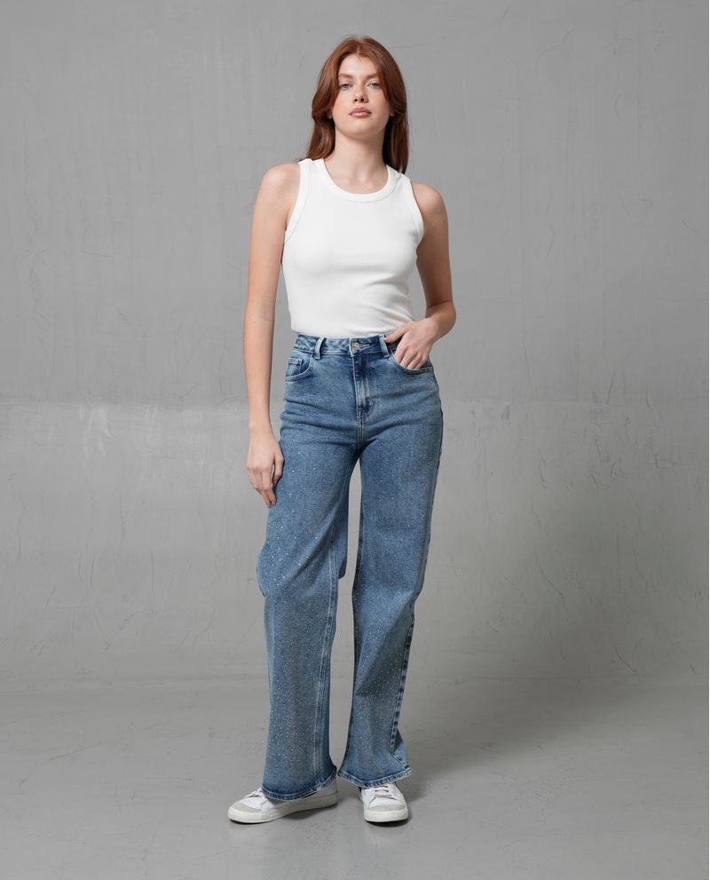 Este jean de moda presenta un diseño WIDE LEG con un tiro alto, ideal para quienes buscan un estilo relajado y cómodo. Confeccionado principalmente en algodón, ofrece una textura suave y resistente, complementada con poliéster, rayón y elastano para mayor flexibilidad. Su color azul clásico y los brillos dispersos añaden un toque visual interesante, haciéndolo perfecto para el uso diario.