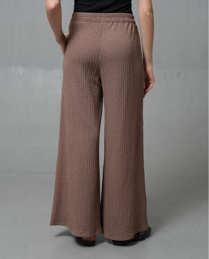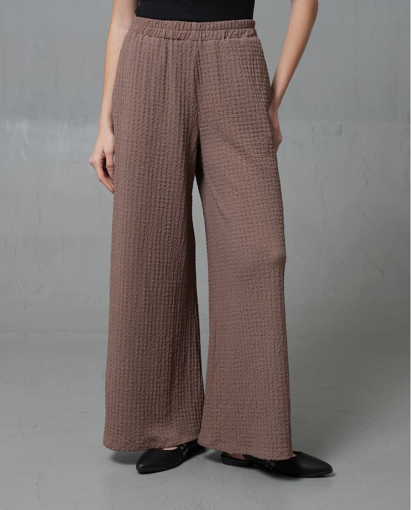 Este pantalón de corte amplio y tiro alto es ideal para aquellas que buscan comodidad y estilo en una sola prenda. Confeccionado en 100% poliéster, ofrece una textura rugosa que añade un toque distintivo a su diseño. Su color marrón uniforme lo convierte en una pieza versátil para cualquier ocasión.