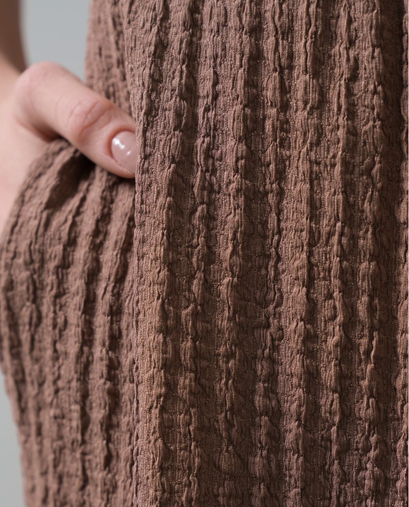 Características: holgado y fluido, con una cintura elástica que se ajusta cómodamente. La textura rugosa del tejido añade un elemento visual interesante.
