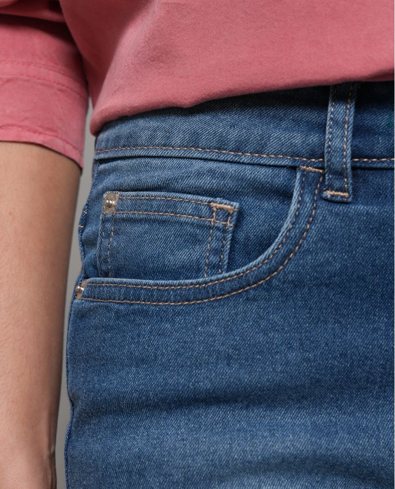Características: Cuentan con un diseño regular fit, tiro alto, dos bolsillos delanteros clásicos, costuras visibles en color contrastante, y un cierre de cremallera. El denim clásico en tonalidad blue wash media le da un toque atemporal.