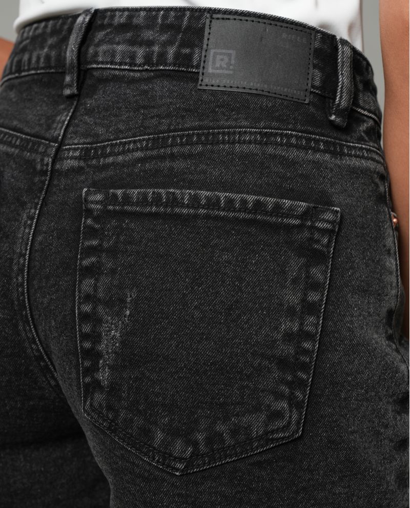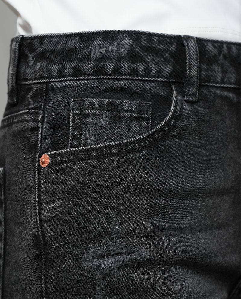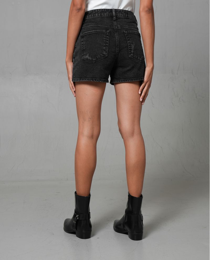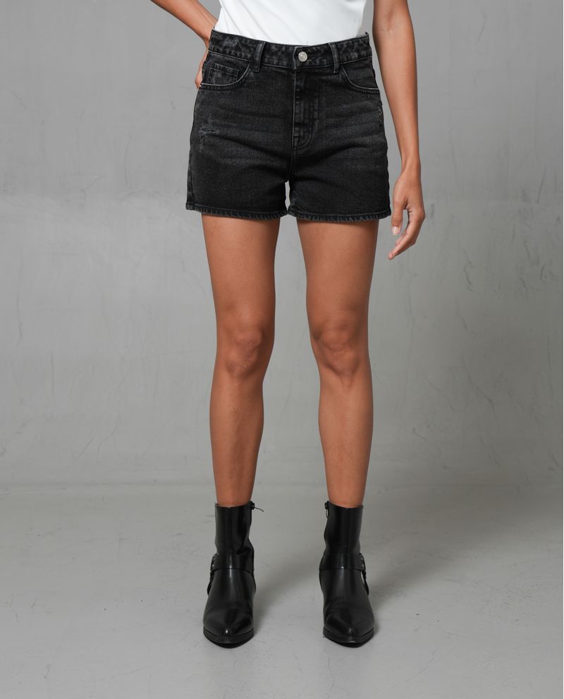 Short de mujer con espíritu noventero. Su silueta Mom en black denim combina a la perfección comodidad y estilo, con cinco bolsillos y un fit relajado que favorece. Los desgastes localizados, rotos en el frente e iluminaciones en costuras, le dan un aire auténtico, ideal para looks elevados con camisetas, botas y pañoletas. *La modelo usa un short talla 6. *Algunas pantallas pueden alterar el color real de la prenda.