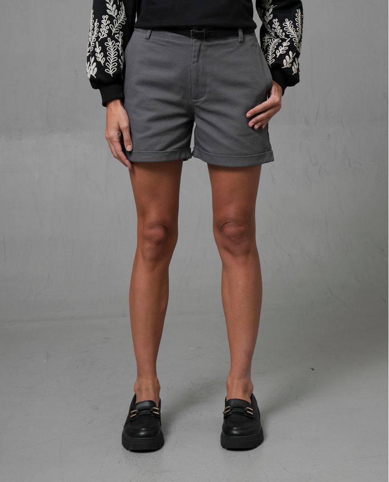 Este short es una prenda esencial en el armario de cualquier mujer. Confeccionado con una mezcla de 82% algodón, 16% poliéster y 2% elastano, ofrece un ajuste clásico y cómodo que se adapta de manera natural a las piernas. Su diseño recto proporciona un look limpio y estructurado, ideal para cualquier ocasión casual. Los dobladillos están limpios y reforzados, asegurando durabilidad. La prenda cuenta con costuras visibles dobles, cremallera y presillas para cinturón en la pretina, con un cierre de un solo botón.