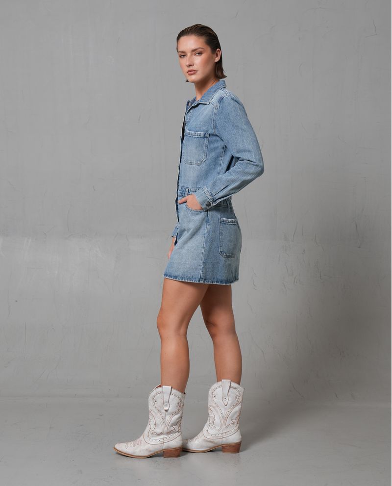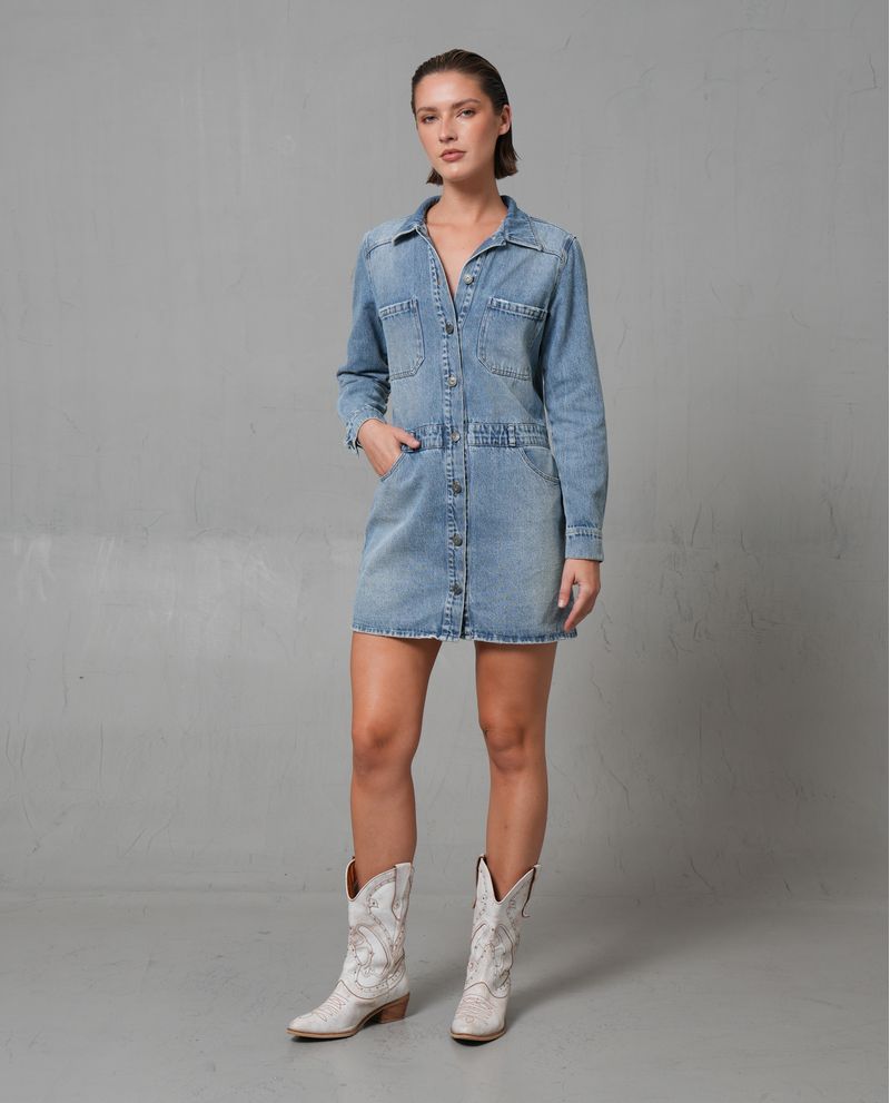 Características: Vestido corto con cuello camisero, corte regular y ceñido al cuerpo, ajustado en el torso y ligeramente recto en la falda. Tela de denim de grosor medio a ligero con lavado medio clásico. Incluye una banda tipo pretina para ajuste y costuras visibles y contrastantes.